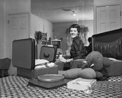 Pictured here is Miss Jane Hogan, shown packing her bags in her bedroom, is daughter of Mr. and Mrs. Sam W. Hogan, 3904 Potomac. Miss Jane Hogan had to leave behind her elephant toy when she left for Mary Baldwin College in Staunton, Virginia.