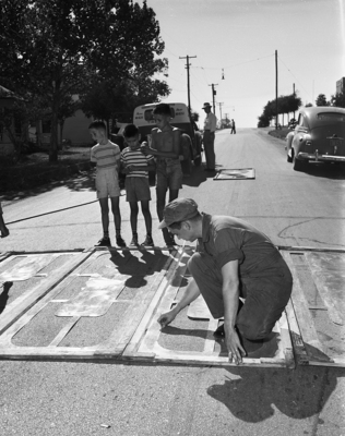 Charles Colby painting speed zone street sign with, left to right, Louis Todd Jr., and Pete and James Martinez