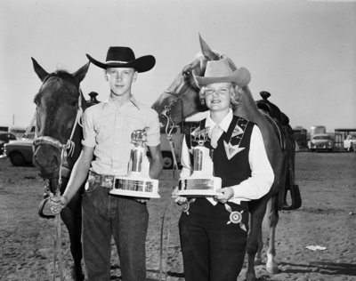 Jerrell Gorczya, left, and Monna Wier show trophies they were awarded by the Fort Worth Horseshoe Club at final performances.