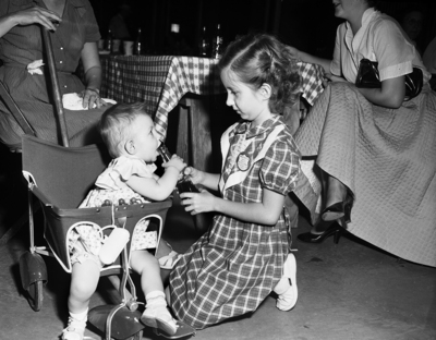 Older brothers and sister pitch in and help their smaller charges have a real Labor Day celebration at the International Association of Machinists at Will Rogers Memorial Grounds. Eight-month-old Celeste Brown gets a drink of soda pop from her sister Patricia Ann.