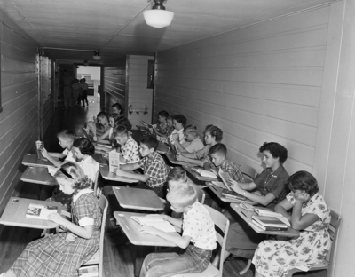 Westcliff Elementary School was like the Mother Goose tale of the Old Woman who lived in the Shoe - both so many children they did not know what to do. But principal Julia Chrisman found an answer. She moved the overflow of pupils into the auditorium and into the halls until frame classrooms can be built. This class, located in a hall, continued its work despite other students wandering in and out.