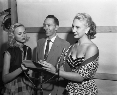 Image shows Miss Lil Marik, left and Miss Jana Hart, right who helped Bob Utter in center, for First Methodist Church Twosome Class's quiz program.