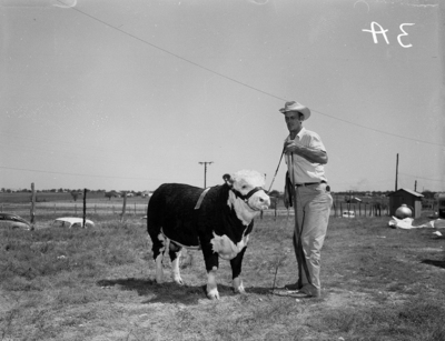 Andrews Hereford Farms' MOA Larry Duke 1st was named grand champion bull at the North Central Texas Fair. Showing the junior Bull is Faby Mashburn, manager of the Tarrant County ranch. Published in the Fort Worth Star-Telegram, September 11, 1953.