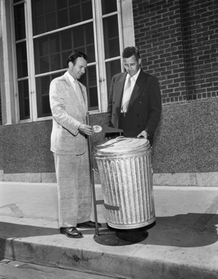 Pictured here are Wes Motheral, left, and Dr. W. V. Bradshaw, city health director, inspecting one of the garbage can holders which were sold by the Junior Chamber of Commerce. The trash holder which did not have a can were sold as a health safety measure and to provide money for the Jaycee youth welfare fund.