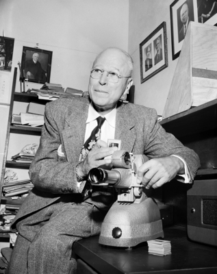 Dr. E. Leslie Carlson with color slide projector. He is a pioneer of 28 years using visual aid in education. He is a professor in the School of Theology at Southwestern Baptist Theological Seminary. In 1925 he did not have a camera and was touring the Holy Land when it occurred to him that his students would appreciate seeing ancient historic scenes. He purchased pictures and postcards of the Holy Land and brought a projector to show his pictures. He later graduated to better and more modern projectors. The slides he uses in the classroom are processed in color. Published in the Fort Worth Star-Telegram on September 13, 1953.