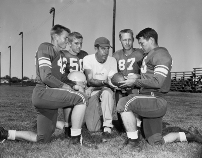 Arlington State College Rebels - New Coach Claude Gilstrap of Arlington State College talks with his Fort Worth delegation. Left to right, Halfback Wayne Thornton, Center Bob Wilson, Gilstrap, Center Bob Baldwin and Halfback Le Vene Hughes. Hughes is from North Side, others from Poly. The Rebels are defending champions of the Pioneer Conference.
