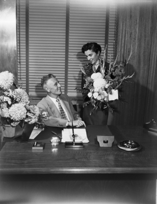 Miss Mildred Reinbolt, secretary, places flowers on the desk of J. P. Kirkland, president of Kirk-Mac Mortgage Company, in preparation for an open house in the firm's new building, 600 Texas St. The president is seating at the desk looking at the flowers.
