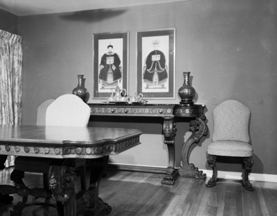 Interior shots of the home of Dr. and Mrs. Arvel Ponton. These oriental objects of art-the Chinese pictures in blue and gold frames and the elegant vases of the same colors-carry the decorative plan of the Ponton home into the dining room. The furniture, out of the boyhood home of Dr. Ponton, was refinished and reupholstered before being placed in a seating of modern and contemporary- a blending resulting in charm and comfort.