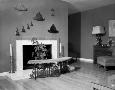 Interior shots of the home of Dr. and Mrs. Arvel Ponton. Temple bells inspired the plan of decoration in the home of Dr. and Mrs. Arvel R. Ponton, 6355 Waverly Way. The brass bells and the Buddhas were brought by Dr. Ponton from Burma where he served during World War II.