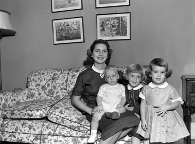 Mrs. John Fosdick of Houston, pictured with her children, left to right, John, 1 year old; Cathy, 2, and, Jan, 4. They have been here visiting Mrs. Fosdick's parents, Mr. and Mrs. F. L. VanZuben, 1606 Mistletoe Boulevard.