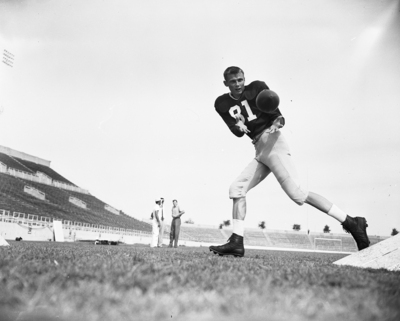 Bill Curtis, sophomore from Waurika, Oklahoma, making first start for Texas Christian University at right end against Texas A&M. Shown catching a football.