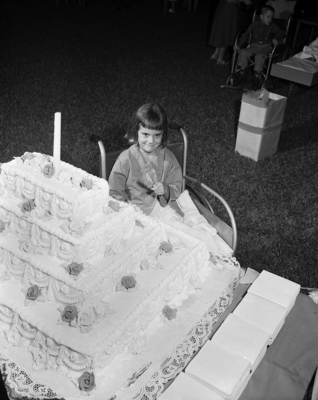 Pint-sized Judy Dwyer had a king-sized job when she cut the first piece of Birthday cake during a celebration by W. I. Cook Memorial Hospital Center for Children on its first anniversary. About 500 Fort Worth residents paid tribute to the hospital at its birthday carnival. Judy, a post-polio patient, is the daughter of Mr. and Mrs. W. L. Dwyer of Cleburne.