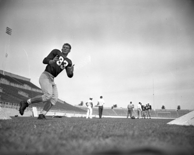 Frogs' Don Sanford, who has caught touchdown passes in last three game, will start at end in this game against mighty Baylor at Waco. A photograph of a football player suited up his game gear uniform, in his football catcher pose. He is waiting for the ball to land in his hands to catch.