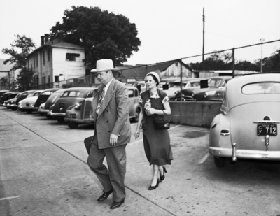 Mrs. Elena Bedford Fant, a former vice president of the First National Bank at Weatherford, is shown with Chief Deputy U. S. Marshal McKelvey as she was brought to Fort Worth to make bond on charges of fraudulent statements. Published in the Fort Worth Star-Telegram in morning edition, May 5, 1950.
