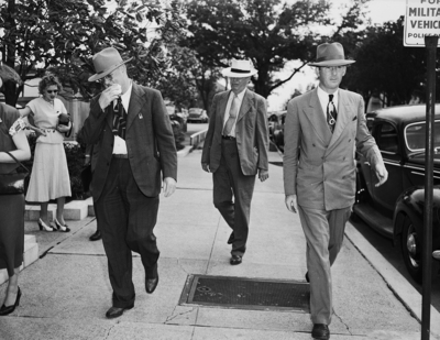 George Fant, left, former president of the First National bank at Weatherford, and James Edward Whitsett, center, former vice president, follow deputy U. S. Marshal Norman into the U. S. Courthouse at Fort Worth after being taken into custody in Weatherford on a federal warrant charging conspiracy and fraudulent statements. Published in the Fort Worth Star-Telegram in morning edition, May 5, 1950.