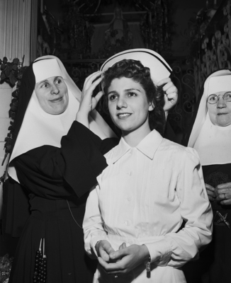 Class President Rita Ippolito of Philadelphia, Pa., broke into the smile she'd been saving three years as Sister Mary Michael placed a graduate's cap on the nursing senior at St. Joseph's Hospital. Published in the Fort Worth Star-Telegram in morning edition, May 5, 1950.