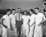 Coach Charles (Bud) Wilkinson poses with five new starters he'll use against Texas as the team works out at Texas Christian University (TCU). Left to right are Left Tackle Don Brown, Right Tackle Roger Nelson, Wilkinson, Quarterback Gene Calame, Left Halfback Tom Carroll and Fullback Robert Burris. Burris is a Sophomore.