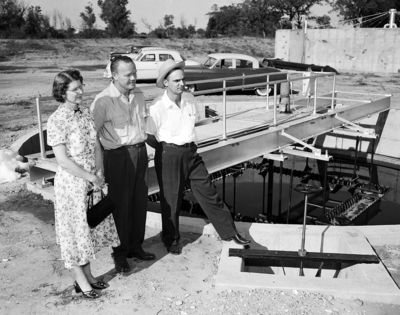 O. D. Steward, center, and Bill Davis, Haltom City councilmen, point out how a part of the new sewage treatment plant operates. Mrs. Ben L. Shurbet of 5812 Ellison was one of hundreds of Haltom City residents who toured the $239, 000 plant.