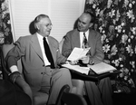 Cecil A. Morgan, left, Fort Worth attorney and member of the State Board of Education, confers with Dr. J. W. Edgar, first commissioner of education, who is to be the principal speaker at a dinner meeting of the Fort Worth Classroom Teachers Association. Published in Fort Worth Star-Telegram evening edition May 4, 1950.
