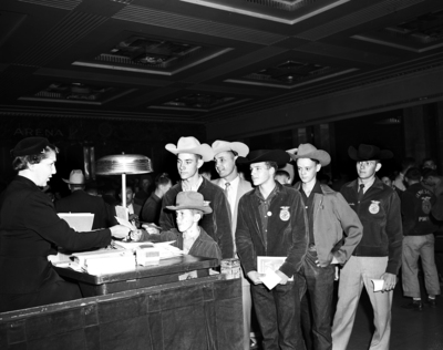 Texas' Future Farmers register at the silver anniversary convention of the FFA in Kansas City, Mo. Left to right are: Will Whittenburg, Dennis Martin, both of Graham; Clyde Wood, teacher of agriculture at Graham; Roy Rue, Olney; and Ken Andrews, Graham. Registering the FFA boys in Betty Jane Schrotberger of the Kansas City Chamber of Commerce.