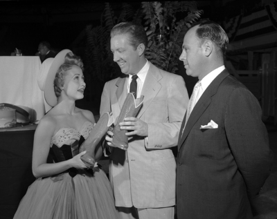 Left to right, Movie star Jane Powell, who is awarded equipment to go along with her honorary Texas citizenship, is photographed with John Justin and Amon Carter Junior, at the United Fund Kickoff.