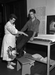 The Fort Worth Crippled Children's Society has started a program of adult rehabilitation at its treatment center, 1508 Hemphill. Robert Whitaker of 1107 Eagle Drive, is learning to lift weights with his paralyzed leg. Miss Helen Kilbourne, a physical therapist, directs him as he exercises.
