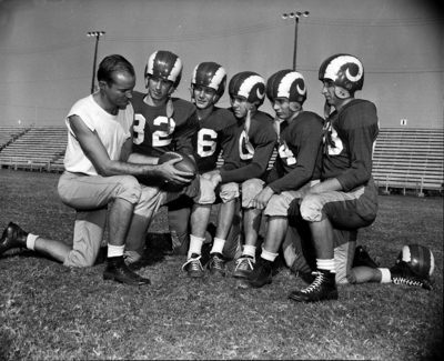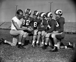 Assistant Coach Lloyd Parker of unbeaten Mineral Wells football team discusses tactics with Backs Jimmy Walker, Sammy Cardwell, Bob Burris, Charlie Bond and Don Burris, left to right Mountaineers play Weatherford, also undefeated after the previous game in 2A-9.