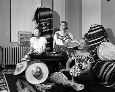 Left to right, Mrs. W. W. Taylor, Mrs. Jack Daly, and Mrs. George W. Stevens, left to right, in authentic fiesta costumes, will market many types of wares from Old Mexico during the Fort Worth Garden Club's Fall Fiesta.