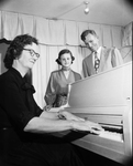 Carroll School Superintendent W. Lee Yantis, and 4-H Club Girl Beth Norman look on as Mrs. Lester Howard, president of the Carroll Home Demonstration, tried out a new piano was presented to the school by the HD Club.