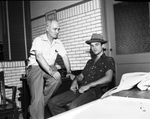 George Eldon Williams, confessed car thief in a chair with a detective sitting on the left side of him. Taking his confession. Williams is wearing a hat and not smiling.