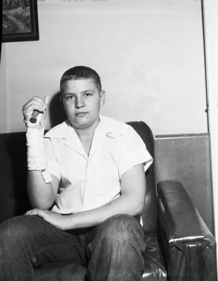 Bennie Vorhies shown with injured arm. Bennie is seated with his right arm bandaged.