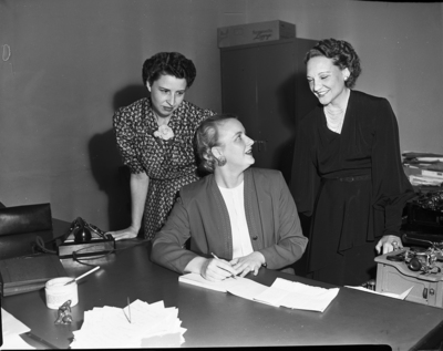 Misses Marguerite Davis, Florence Kerr and Marilyn Rine, left to right, discuss plans for the Fort Worth Legal Secretaries Association Bosses' Banquet to be held at 7 P. M. Monday at Hilton Hotel. Three woman in an office, two are standing up and the other sitting down in the center with a pen and paper.