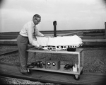 A. J. Knarr, meteorologists, shows how spectrophotometer works. A man wearing formal wear setting up equipment.