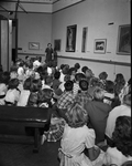This scene is repeated each Tuesday afternoon in Fort Worth Art Association's Public Library gallery, when sixth graders from city's schools gather for art appreciation lectures and demonstrations. Represented here are Circle Park, Oaklawn and Sam Rosen Schools. A classroom full of children of all genders, and a teacher standing by the door wearing a dress.