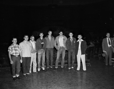 Pictured here in the main auditorium of the national FFA convention are, from left to right, Charlie Svoboda, Joe Willard, Jimmy Morrison, Charles Bridier, Sam Curl, Ronny Feazell, Bobby Campbell, and Harley K. Reed.