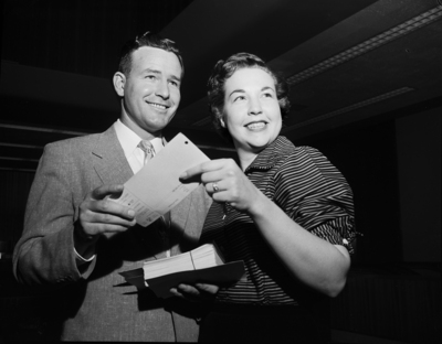 The Continental National Bank had the highest per capita average in first reports of the United Fund campaign. Russell McDaniel of the bank's loan department is shown here receiving the last report card from a bank employee, Mrs. Lou Owen.