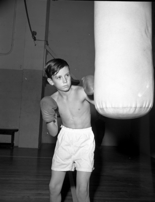 J. C. Elam, 12-year-old, had been hitting a punching bag as he prepared for Midget Gloves tournament. A kid with boxing glove standing on the side of a punching bag. He has his hands and arms up.