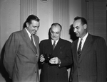 Earl E. James, center, of Oklahoma City, grand exalted ruler of the Elks Lodges of the United States, had went for a visit to the Fort Worth lodge with him were J. Marcus Brown, left, exalted ruler of the Fort Worth lodge, and Earl E. James Jr., of 5037 Glade, son of the national official and a member of the Fort Worth lodge. Three men wearing suits and ties. The man in the center is holding some type of technology.