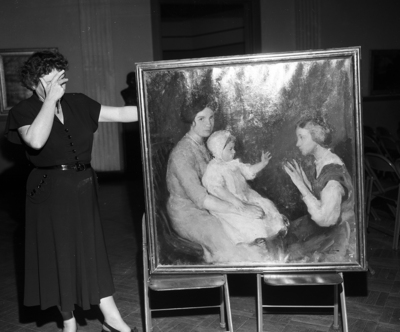 This Fort Worth Art Association-owned painting, "Mother and Children" by Charles Webster Hawthorne, is one of a series from the permanent collection which will be sent to the El Paso International Museum this winter. A painting is sent by the association each month and is featured by the museum as " Picture of the Month." an unidentified woman is holding up the painting.