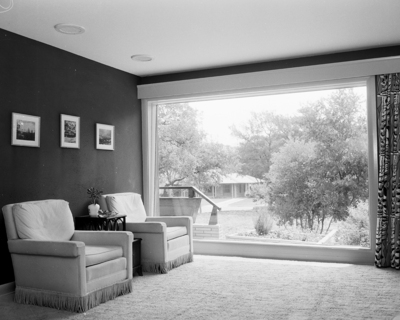The trend in modern architecture is to open up the home to the great outdoors. That was done effectively in the new home of Mr. and Mrs. Luther Henderson, 2704 Colonial Parkway, where a plate glass window, 6 by 9.5 feet, covers most of the front wall of the living room. Published in Fort Worth Star-Telegram morning edition May 14, 1950.
