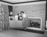 Architects and builders now have a new problem of a niche or cabinet for the television set. The problem was solved nicely in the home of Mr. and Mrs. Luther Henderson, 2704 Colonial Parkway, where a cabinet was built over the wood box beside the fireplace. The home was designed by Frank H. Tolbert, architect. Published in Fort Worth Star-Telegram morning edition May 14, 1950.