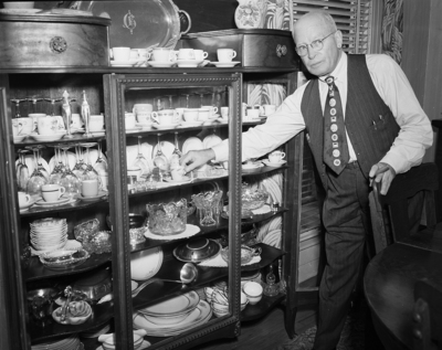 Harry A. Granger reaches for one of the nearly 100 after-dinner coffee cups used by American railroads and steamship lines which he was collected during the past two years. Mrs. Granger generously lends her China to her husband's collection.