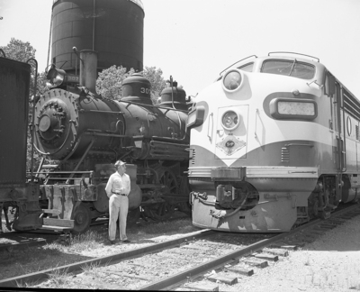 Henry Hassell, oldest machinist in point of service at the Lancaster Shops, stands by the first type steam locomotive he ever worked on and looks at the powerful new diesel that has shunted aside the coal-burner.