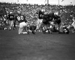 Baylor's Mickey Sullivan is swarmed by Aggie tacklers after a three yard gain in the second period at A&M. The Aggie coming up at left is Louis Capt (69). Others are unidentified, Baylor won 14 to 13.