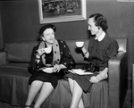 Stopping long enough for a cup of coffee in the Fort Worth Fashion Market's "hospitality suite" at Hotel Texas are buyers from Seymour, Mrs. Don C. Martin, left, and Mrs. John Parks, here for the market's first showing of spring clothes.