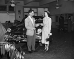 Mrs. Ben Monfort of 3914 Medford signed up the exact number of times 15 to win the first of several automobiles to be given away by 17 merchants in Fair East Shopping Center. She received keys to a new Ford Monday from Dick Danner.