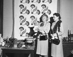 Mrs. Claude B. Wilkerson, left, and Mrs. A. B. Spain, members of the Woman's Club ways and means committee, admire an early 19th Century bowl-and-pitcher set from a Connecticut farmhouse at the club's 13th annual antiques show, in progress in Anna Shelton Hall. In the background is an intricately pieced and quilted spread, in "Cockscomb" pattern, also from Connecticut, and around 100 years old. The two women are shown standing in front of the quilt.