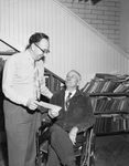 James Whitehurst, 81-year-old amputee, hands his United Fund contribution card to E. O. Dibb, manager of Goodwill Industries. The Industries' handicapped workers reported 100 per cent in their giving to the campaign.