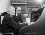 E. E. Anthony, left, vice president of the State National Bank at Comanche, who has faithfully served as deacon in First Baptist Church there since 1902, reviews past experiences with Thomas R. Holmsley, his friend for 50 years. Anthony is 83 years old and has relinquished the presidency of his bank to his son, Boyd Anthony, and assumed title of vice president.