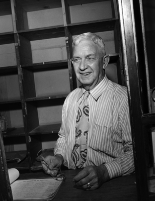 James S. Acuff, 65, of 713 Ayers, is shown sitting by a desk. Acuff is shown as he recalls the old Commerce Street Well and the early days of Fort Worth. Published in Fort Worth Star-Telegram morning edition May 7, 1950.